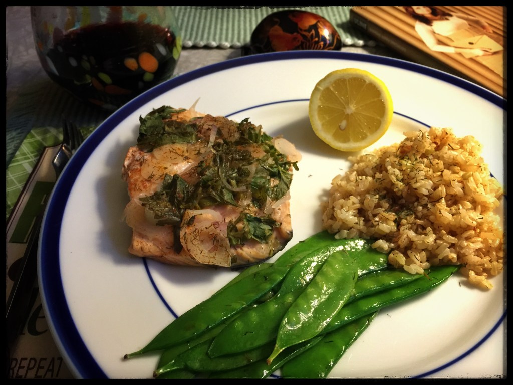 My mom and dad started getting meals from Blue Apron. These meals are a bit fussy. Which I love but my mom does not. Lots of little bits and pieces that make everything lovely. And every ingredient is of the finest quality. I couldn’t be more impressed. So we have been the benefactors of several of the meals since they do not make them. I don’t always use everything the way that it was prescribed. I just mix them up and use them here and there. This dish was extremely simple. We grilled the salmon wrapped in tinfoil with goodies inside. It was accompanied by organic brown rice and sugar pea pods. It was wonderful.