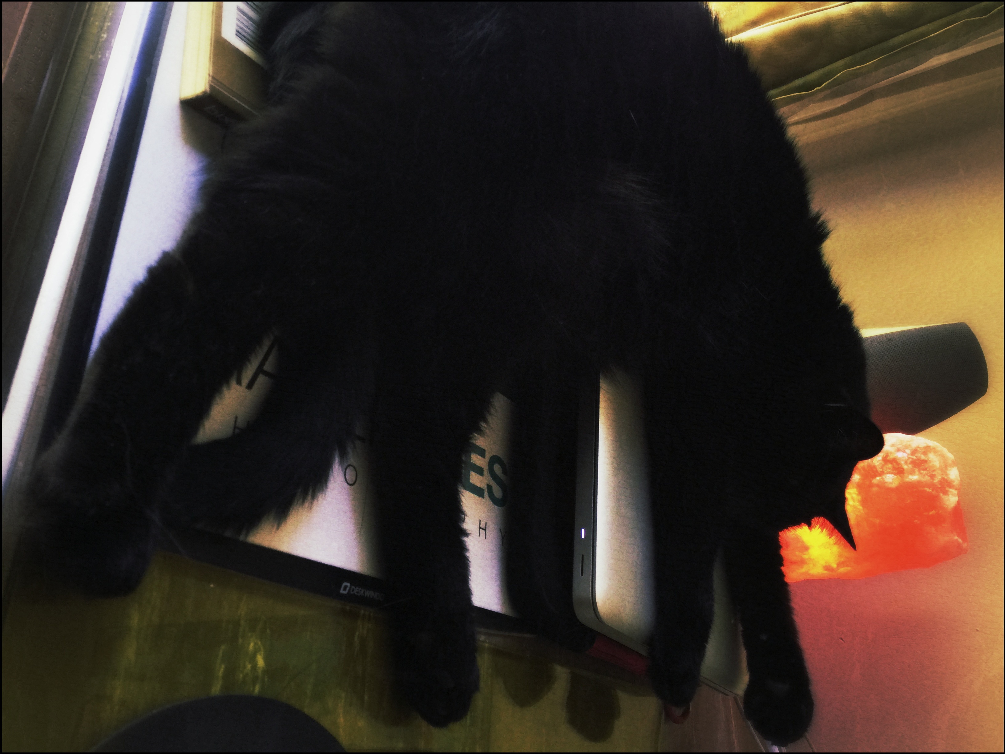 As I stated earlier, I have dictated today MUST be a slow and easy day. My constitution demands, requires it. I am allowing myself to follow my whims. To stop so I can observe the world within and out. As I finished my last blog post and was perhaps going to get up and move to the next thing I looked at Lizzy napping by the salt lamp. Hung over my laptop and across the side of my desk, the extended legs, tail and head made me think of a tangled mess of octopus. Dark and reaching out everywhere. I knew this shot would be a good candidate for grunge, lots of color and mood. Unlike food shots which have to be rather straight on the processing side. I pumped it up and then threw on a filter. I love the result. It’s exactly like what it made me see when I first looked at her and the composition just jumped out at me.