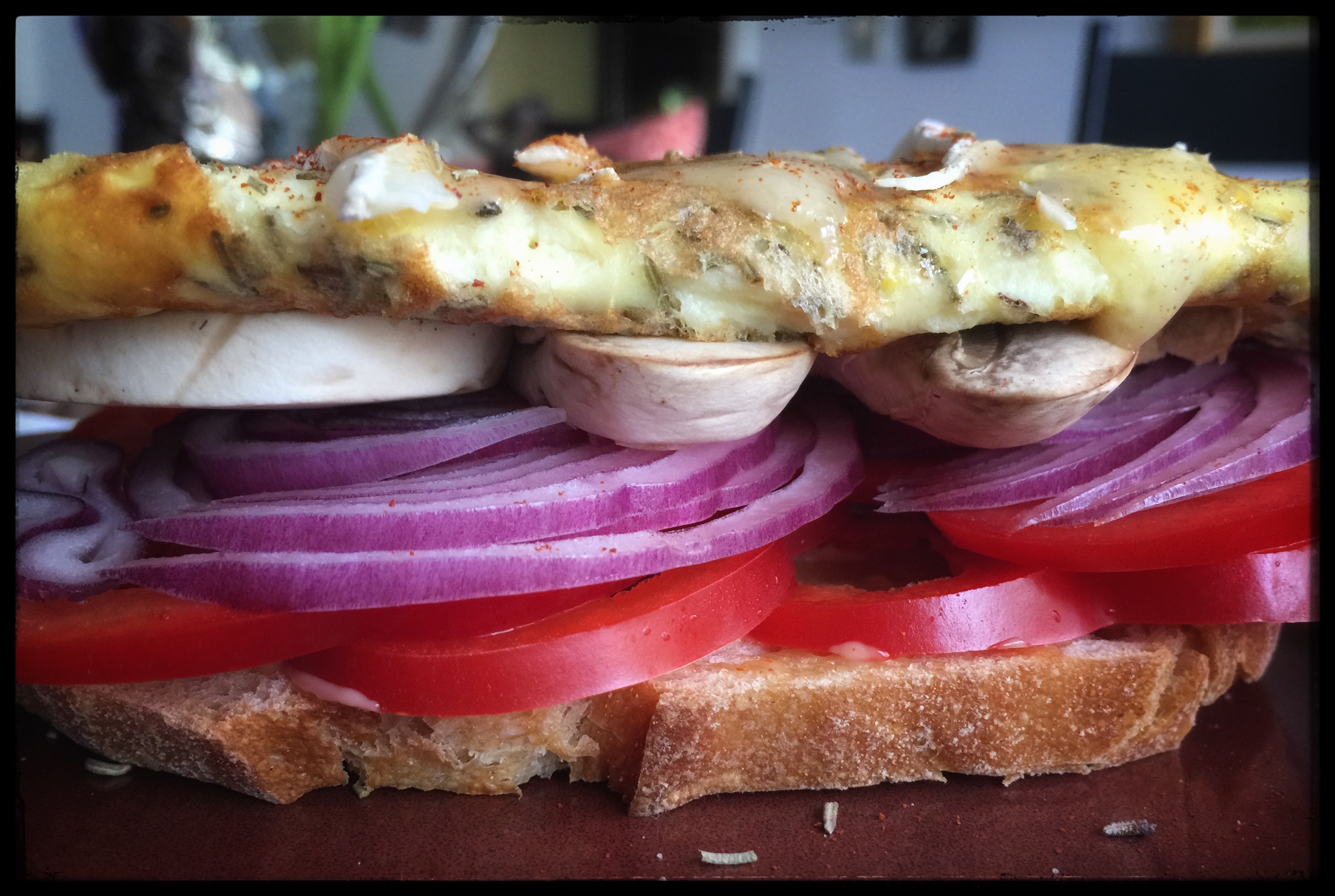 What a lovely delicious combination. Italian bread, spicy mayo, red peppers, red onion, mushrooms, egg and Brie. A little rosemary and sea salt. Relish.