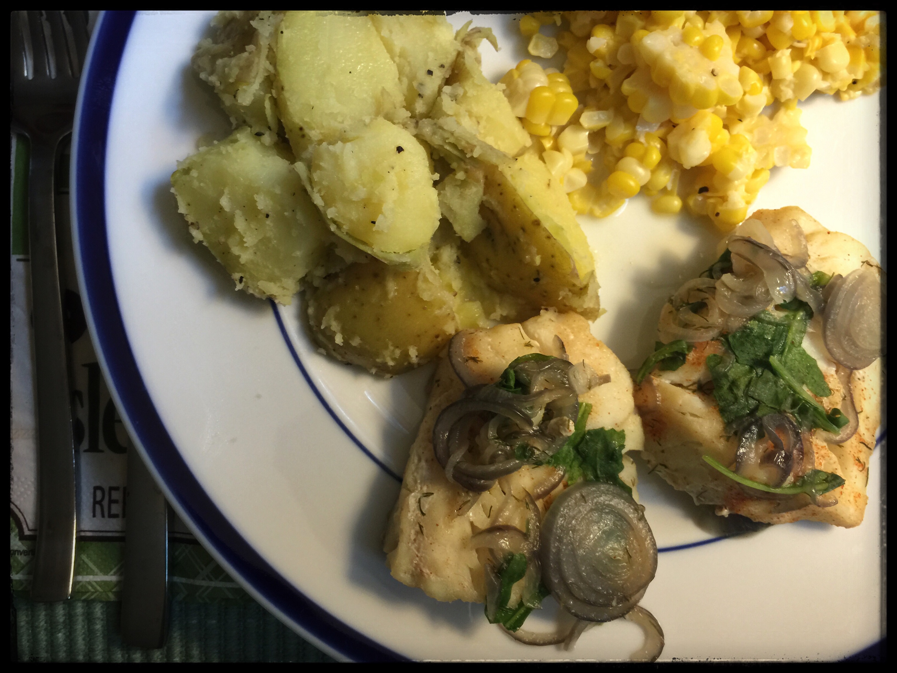 Alaskan Cod. Red onion, arugula, paprika, butter and sea salt. In tin foil on the grill. Corn cut off the cob, cream, honey, sea salt and black pepper. Potatoes, cut, boiled, buttered. Salt and pepper. Red wine blend. Apothic. Simple yet satiating.