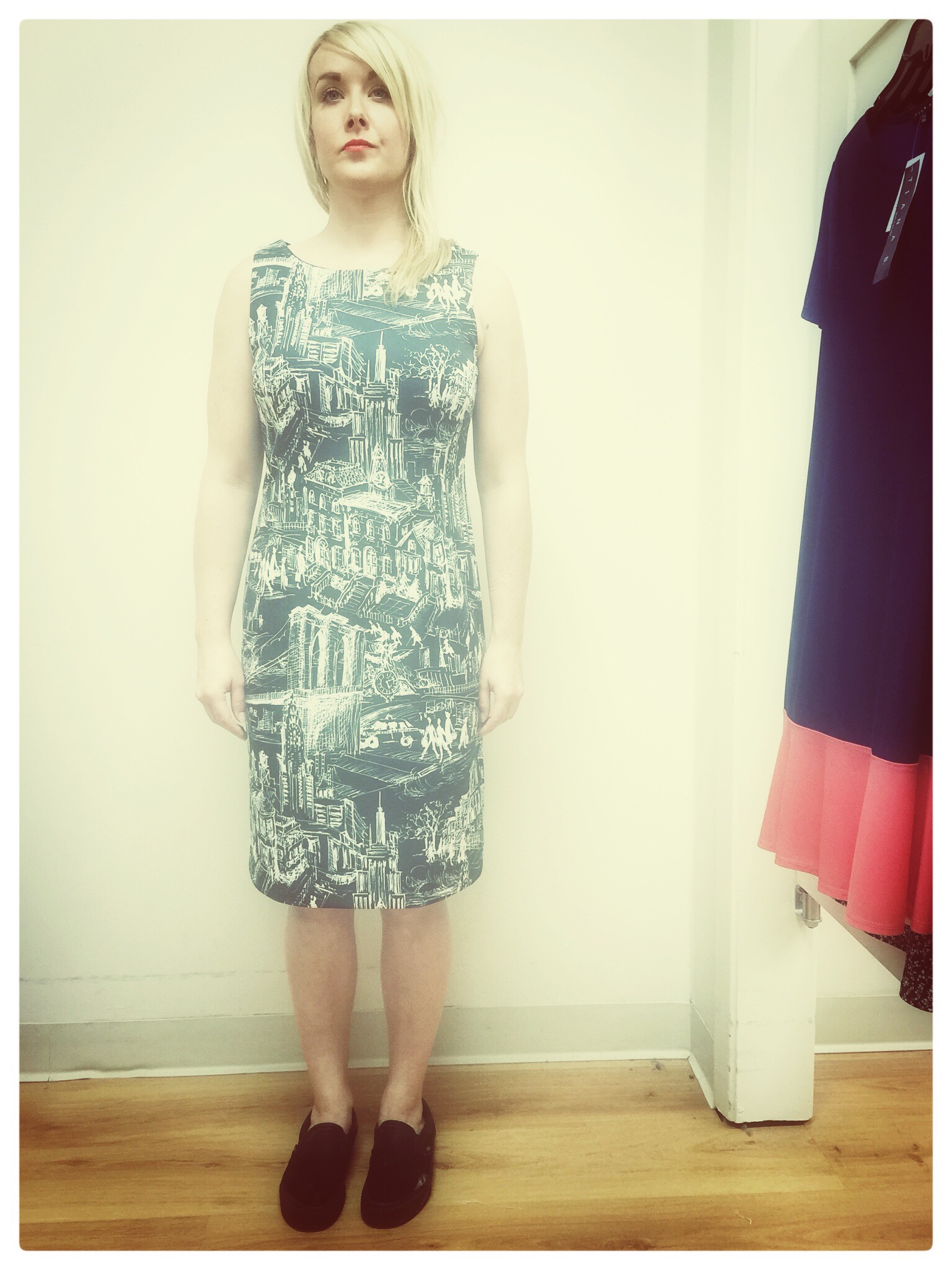 My daughter Claire needed some work clothes. You never know when you’re going to find something. It can be all or nothing. We were lucky this time. This dress was so cool. A little work of art. She wears it well.