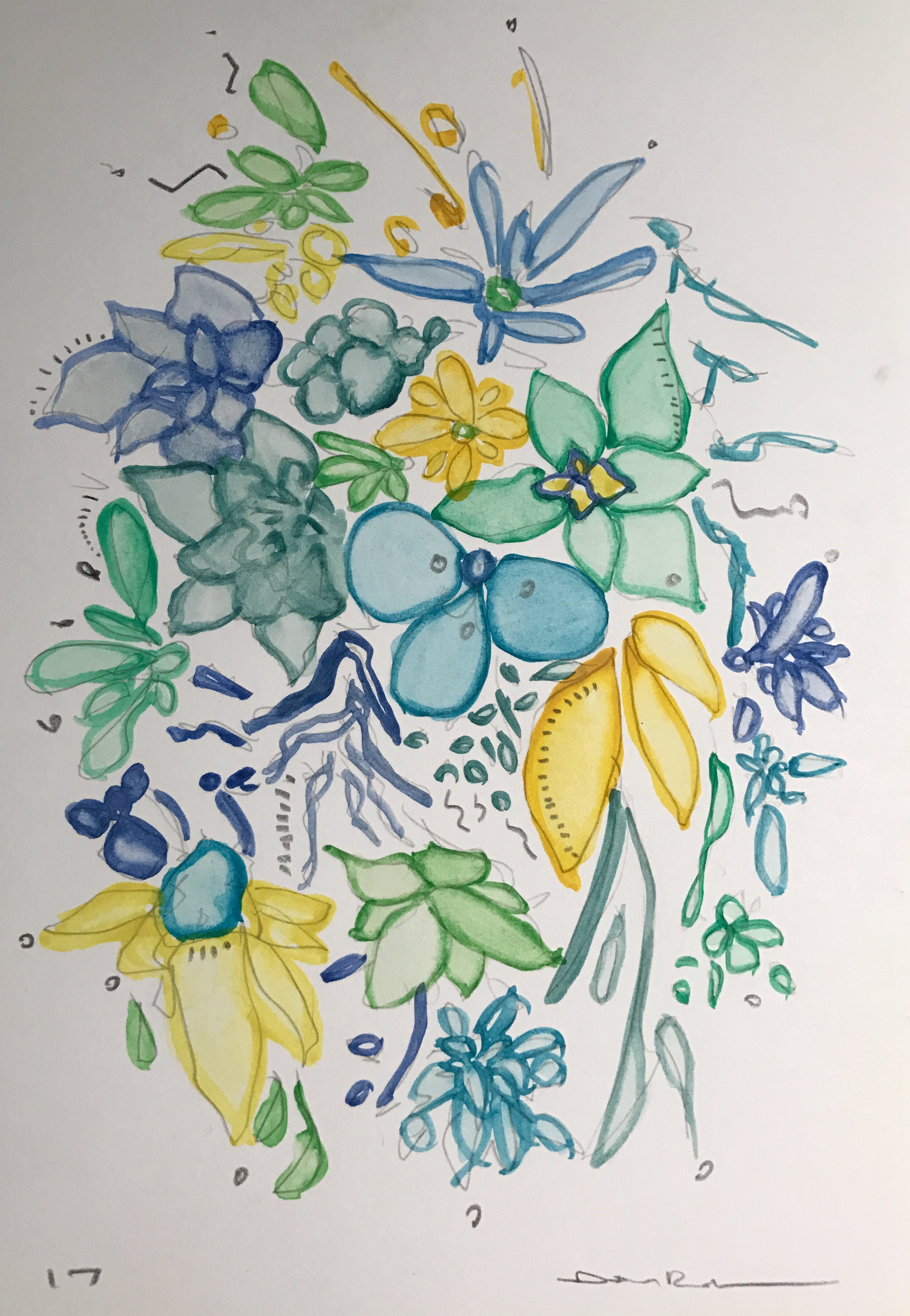 A watercolor of leaves and blooms.