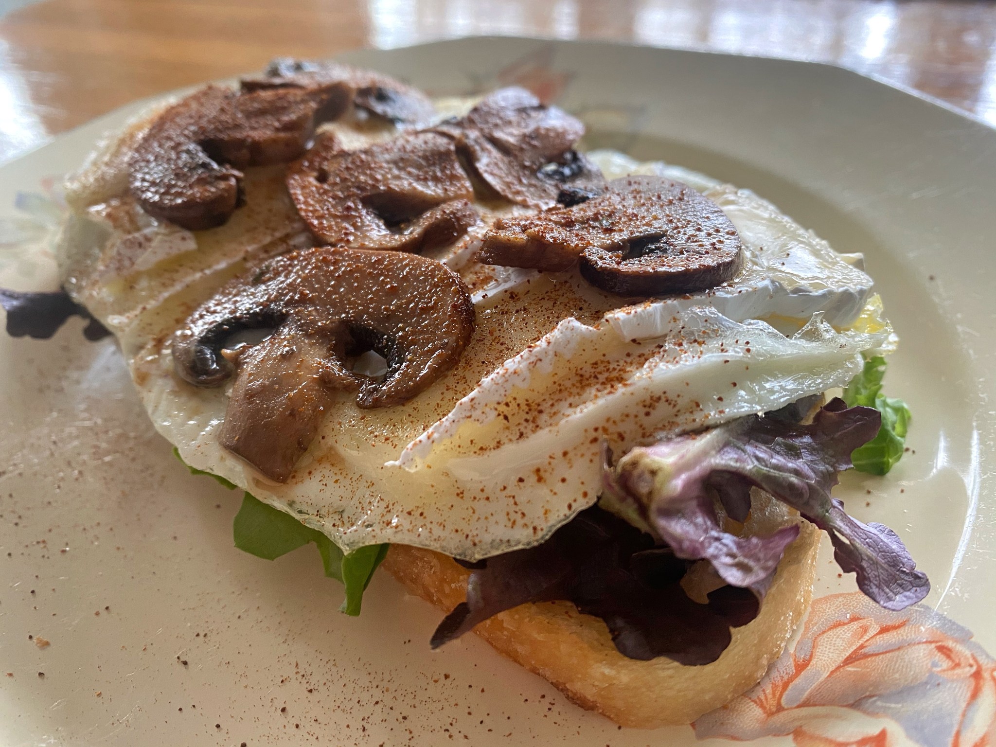 No leftovers here. Sourdough bread, butter, eggs over easy, baby lettuce, Brie, sautéed mushrooms, sea salt and smoked paprika.