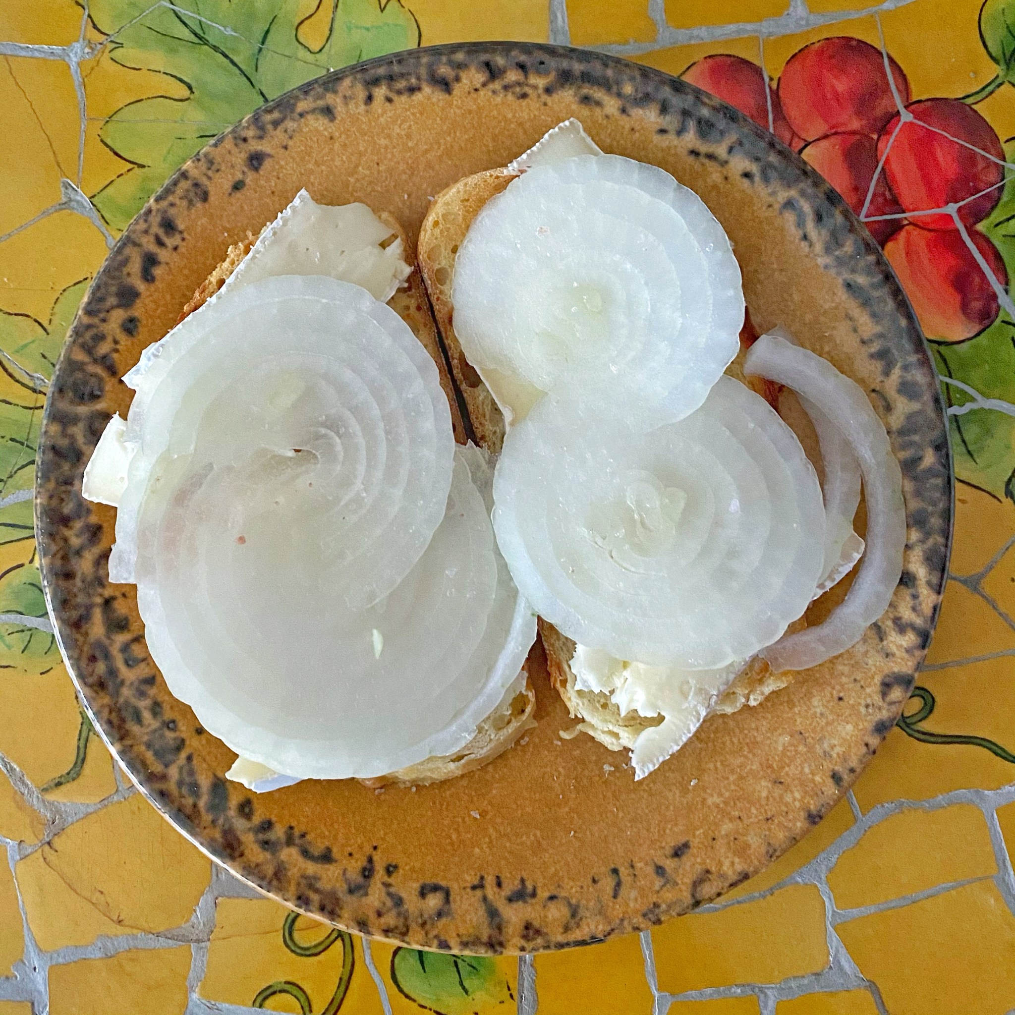 Sometimes simplicity is best. Asiago bread, toasted, and topped with Brie, sweet onions and sea salt.